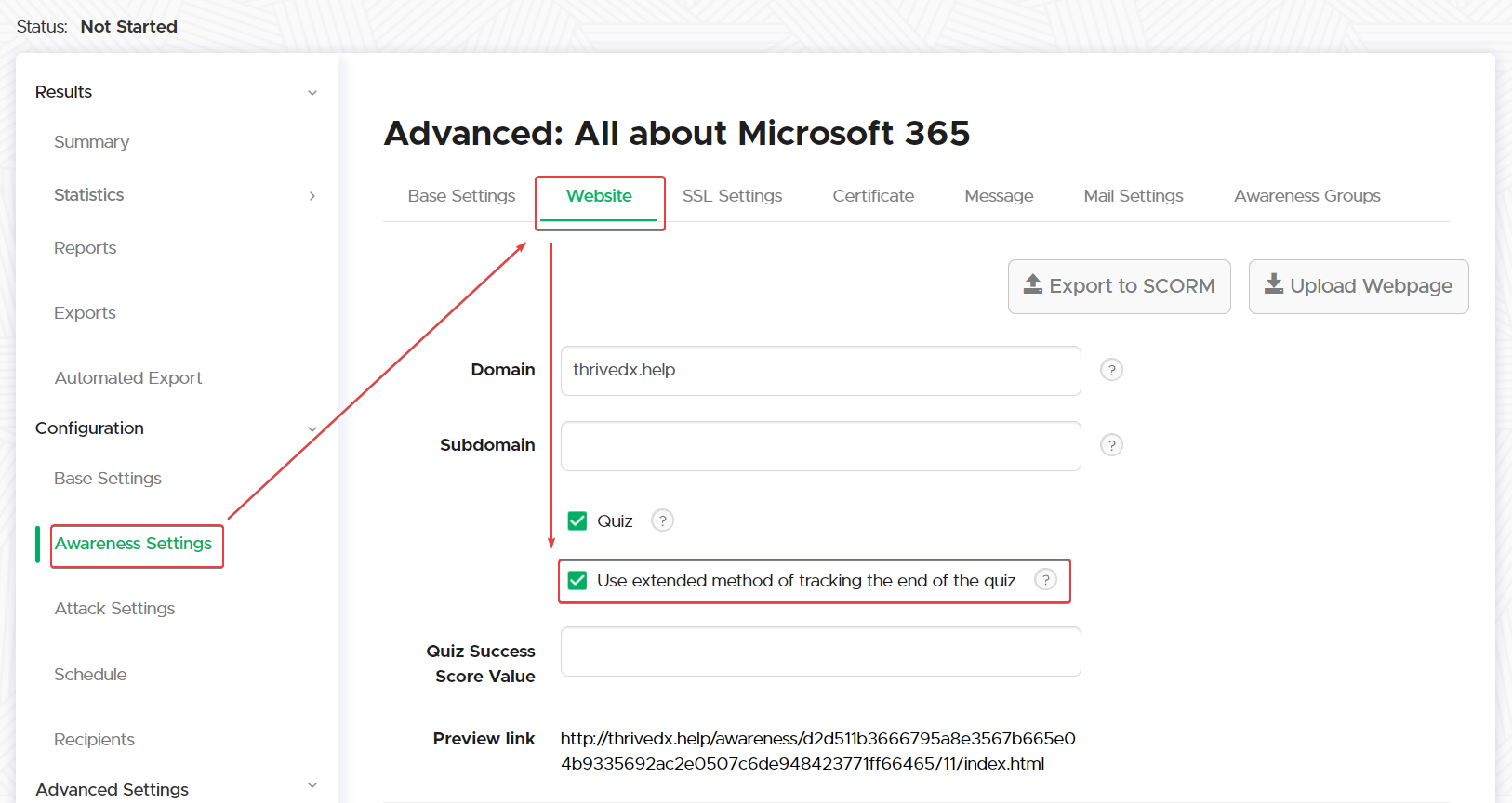 "Use extended method of tracking the end of the quiz" is available to monitor when users complete a quiz at a pre-defined placeholder within the Awareness template. This option can be found on the Awareness Template editing page.