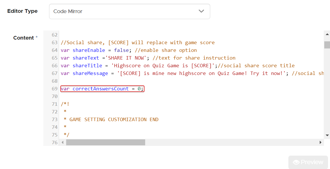 1. Add a new variable `correctAnswerCount` to keep track of the number of correct answers: