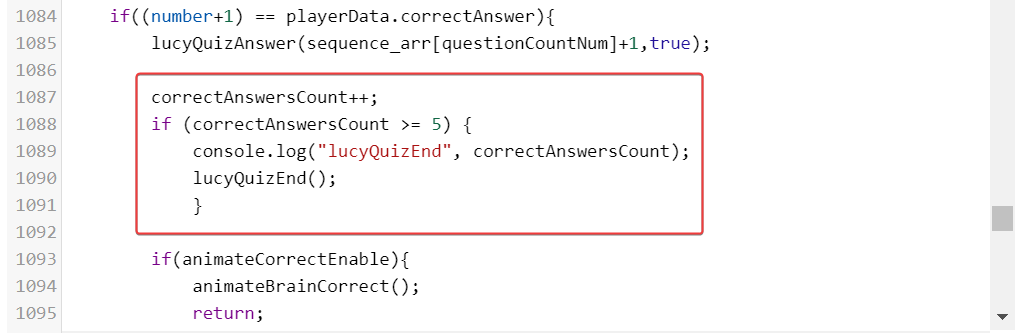 5. Find the place in the code where the function `lucyQuizAnswer()` is called and insert a call to the function `lucyQuizEnd()` after it with the condition as shown below: